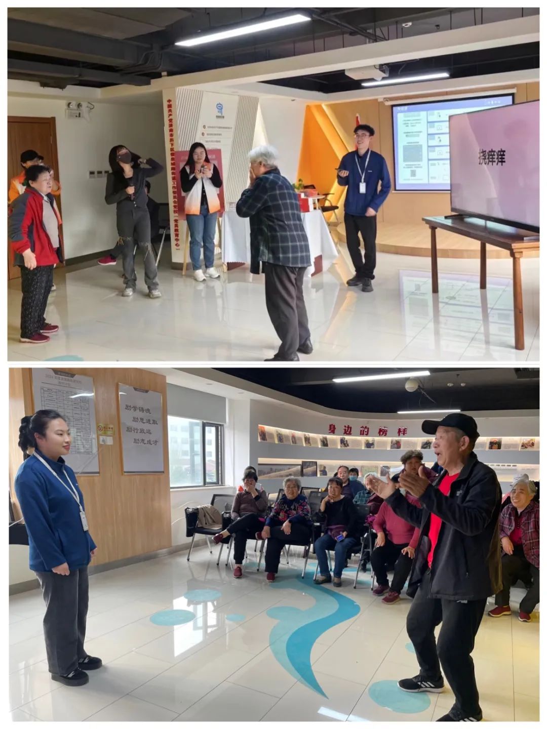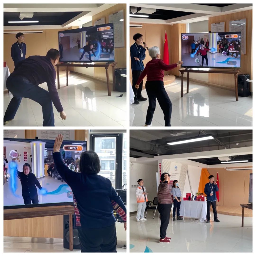 在活动中,每位叔叔阿姨都展现了出色的运动技巧和团队协作能力。单手运球和吹球过河的游戏讲究单枪作战,每位参赛者都能“快、稳、准”地将球运送到终点。AI摸球、趣味体操和比划猜环节则更加注重团队合作和沟通,通过默契的配合与互动,不仅体验到了科技带来的乐趣与便利,更在欢笑中加深了彼此的了解与友谊。