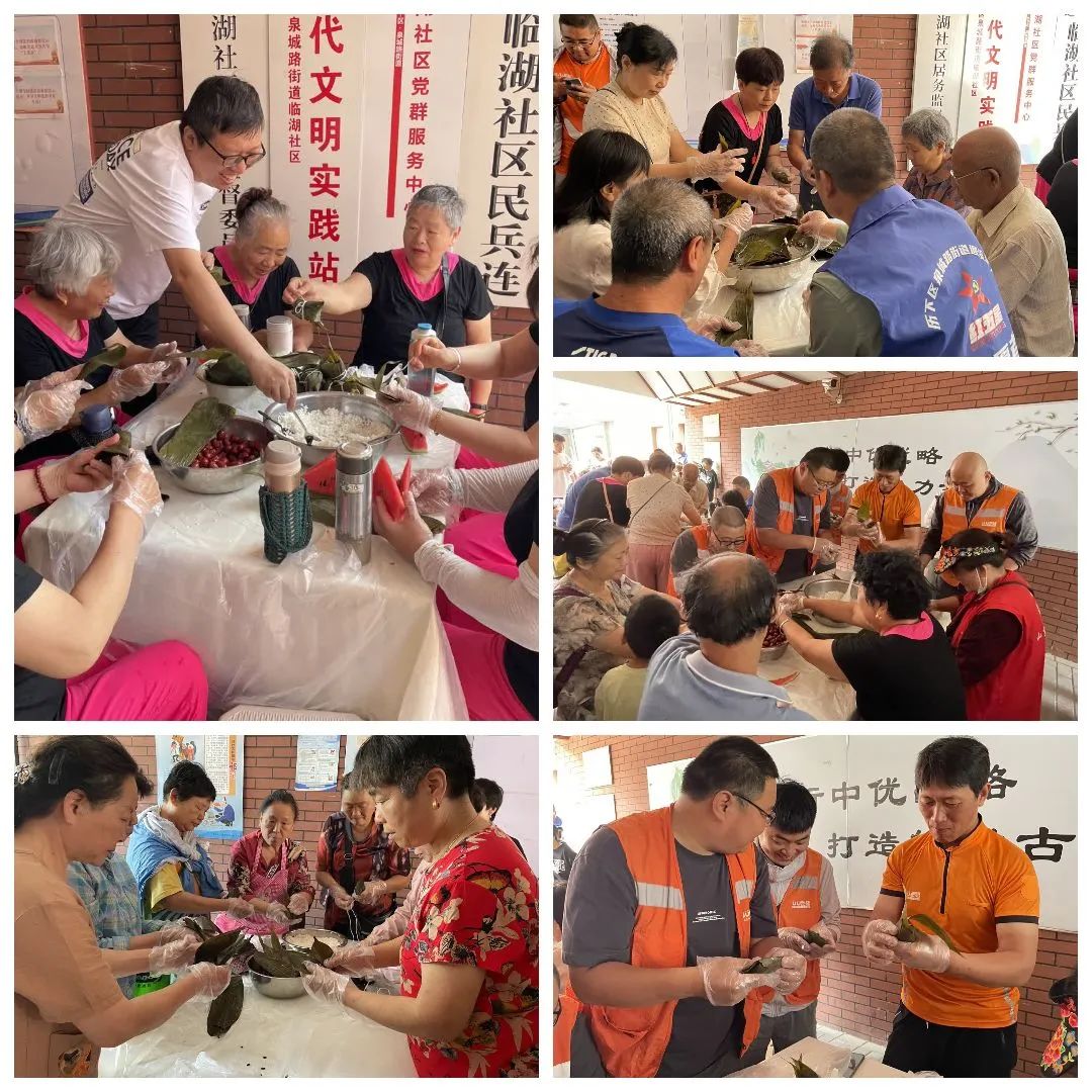 社工站联合临湖社区、uu跑腿开展的包粽子活动,社区红枫叶舞蹈队的阿姨们倾情献舞,为现场注入了浓厚的节日氛围,激发了在场每一位参与者的热情。