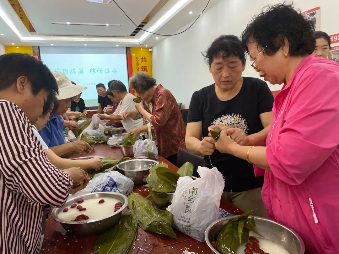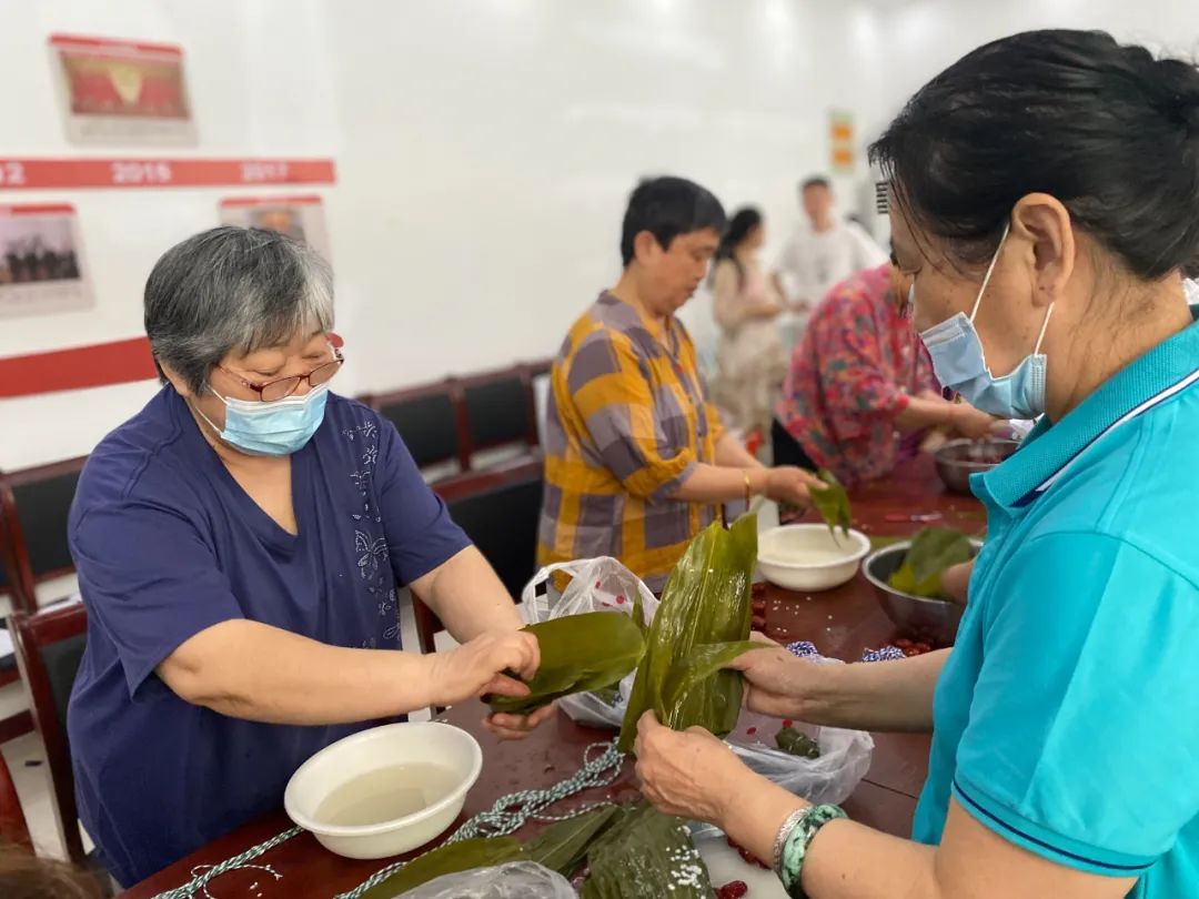 最后的包粽子环节是压轴戏,大家期待已久。糯米、粽叶、红枣等食材整齐地摆放在桌上,空气中弥漫着粽叶的清香。居民们积极踊跃参与到包粽子的过程中。有的手法熟练,不一会桌面上的粽子像小山一样堆积起来;有的在认真学习如何折叠粽叶、装填糯米、包裹捆绑,尽管手法略显生疏,但每个人都兴致勃勃,努力尝试。