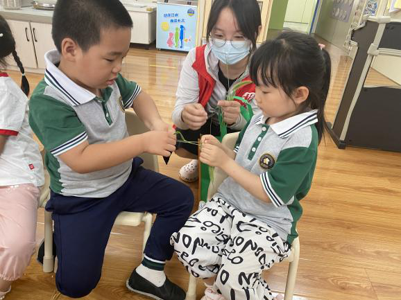 活动开始,社工通过视频资料向小朋友们介绍了芒种节气的由来、天气以及习俗。还给小朋友们讲解了一些有关芒种时节的民俗、农事活动和养生知识等。小朋友们在学习中了解到了芒种是农民最忙的时节,同时也寓意着播种希望,收获喜悦:社工们分给每个孩子一束麦子,让孩子们观察成熟的麦子并说一说麦子是什么样的,孩子们在观察小麦的形状颗粒之后,争先恐后地举手发言,“金黄金黄的”,“一粒一粒的”,“还会扎人”“小麦还有一股甜甜的香味呢!”现场热闹极了。最后,社工带领孩子们一起玩起了芒种时节的一种游戏——斗草,孩子们拿着草像拔河一样,看看谁的小草比较坚韧。在斗草中,通过一轮轮的尝试、观察和总结,最终得出结论:选择草茎,不能选择太干的,也不能选择太细和太嫩的,要选择既粗壮又柔软的草茎,这样的草韧性较大,更不容易断。既为小朋友们提供了亲近大自然的机会,也因其趣味性强,能激发小朋友们探索大自然的积极性,增强小朋友们的求知欲和好奇心,感受斗草的乐趣。