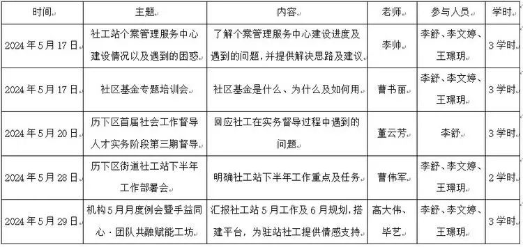 5月,社工站共参加督导培训5次,共计33个学时。社工站参加了社区基金、实务阶段督导、个案管理服务中心建设、团队凝聚力等方面的督导培训。在各类培训中,社工站进一步加深了对社区基金的理解,明确了社工站下半年工作重点及个案管理服务中心建设要素,缓解了驻站社工工作及生活压力,以便下一步社工站不断优化个案管理服务中心建设,联动社区基金力量,开展分层分类帮扶工作;在督导中,督导老师解答了社工站在服务对象依赖关系处理及服务专业性呈现等方面的困惑,一方面助力督导实习工作有效推进,另一方面有助于将所学服务专业性呈现技巧运用到社工站个案管理服务中心建设。
