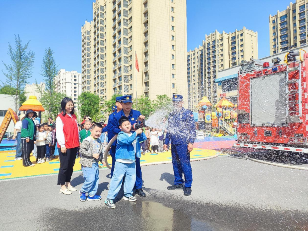 活动现场,一辆威武的消防车停放在幼儿园里,成为了孩子们关注的焦点。消防官兵首先向孩子们介绍了消防车的各项功能和用途,让他们对消防车有了初步的认识。随后,官兵们耐心地向孩子们解释了两种消防服的区别,一种是用于救火的消防服,另一种是用于应急救援的消防服。在官兵们的指导下,孩子们兴奋地穿上消防服,仿佛瞬间变身成为小小消防员。为了让孩子们更加直观地了解灭火器材的使用,消防官兵们还现场演示了喷水器材的操作方法。孩子们兴奋地围观着,目不转睛地看着水流从喷水枪中喷涌而出,仿佛真的在进行一场灭火行动。官兵们还邀请孩子们亲自尝试操作喷水器材,让他们亲身感受灭火器材的威力和用途。通过这次亲身体验,孩子们对消防器材有了更加直观的认识,也深刻体会到了消防员在灭火救援中的辛勤付出和重要作用。