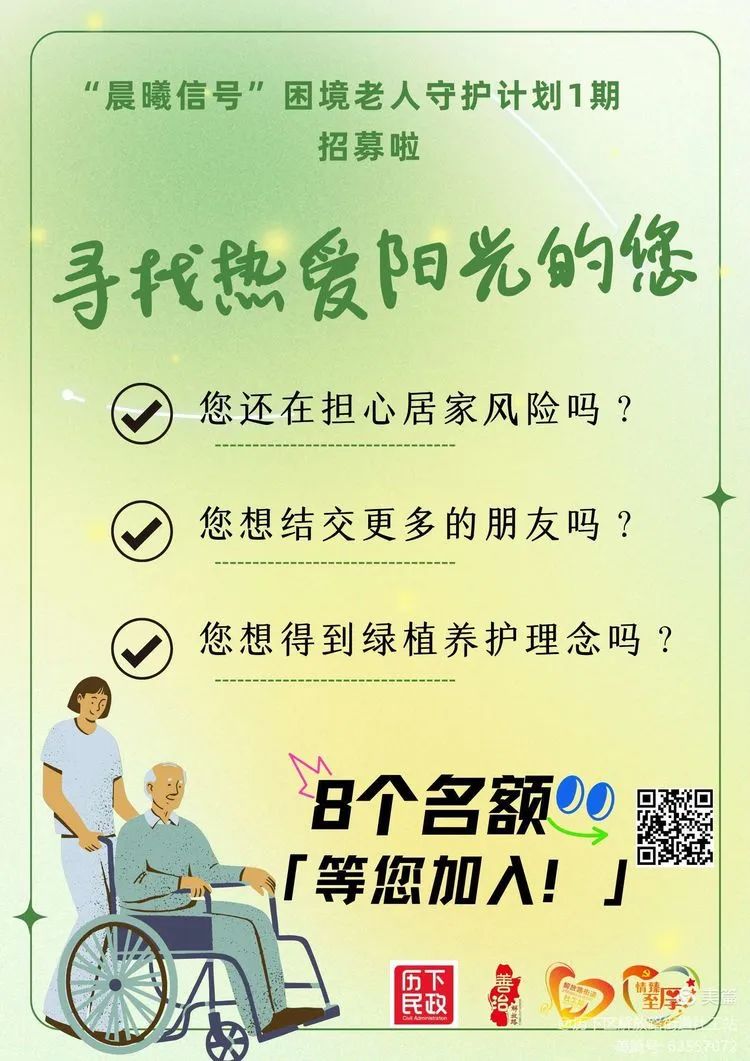 “晨曦信号”守护计划现正式向社区内的低保、低边、高龄独居等困境老人及其家庭发出邀请,招募有意向的居民参与本项目。社区“智囊团”将定期观察您家中窗帘的开合情况,查看您是否按约定打开窗帘;关注您家中绿植的生长状态,提供专业的养护方法;发现异常情况或收到您的一键呼叫,志愿者将立即进行现场确认并联动解放路街道社工站与后坡街社区提供必要的帮助与支持。