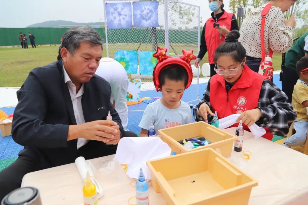 随后,我们带领大家走进扎染的世界。扎染,这一古老的民间传统染色工艺,以其独特的魅力吸引无数人的目光。在社工的指导下,孩子们利用颜料、丝巾、麻绳等工具,亲手体验了扎染的乐趣。他们或扎紧、或松开,每一块布料都承载着孩子们的奇思妙想。当解开麻绳的那一刻,绚丽多变的扎染作品呈现在大家眼前,孩子们的脸上洋溢着满足和喜悦的笑容。