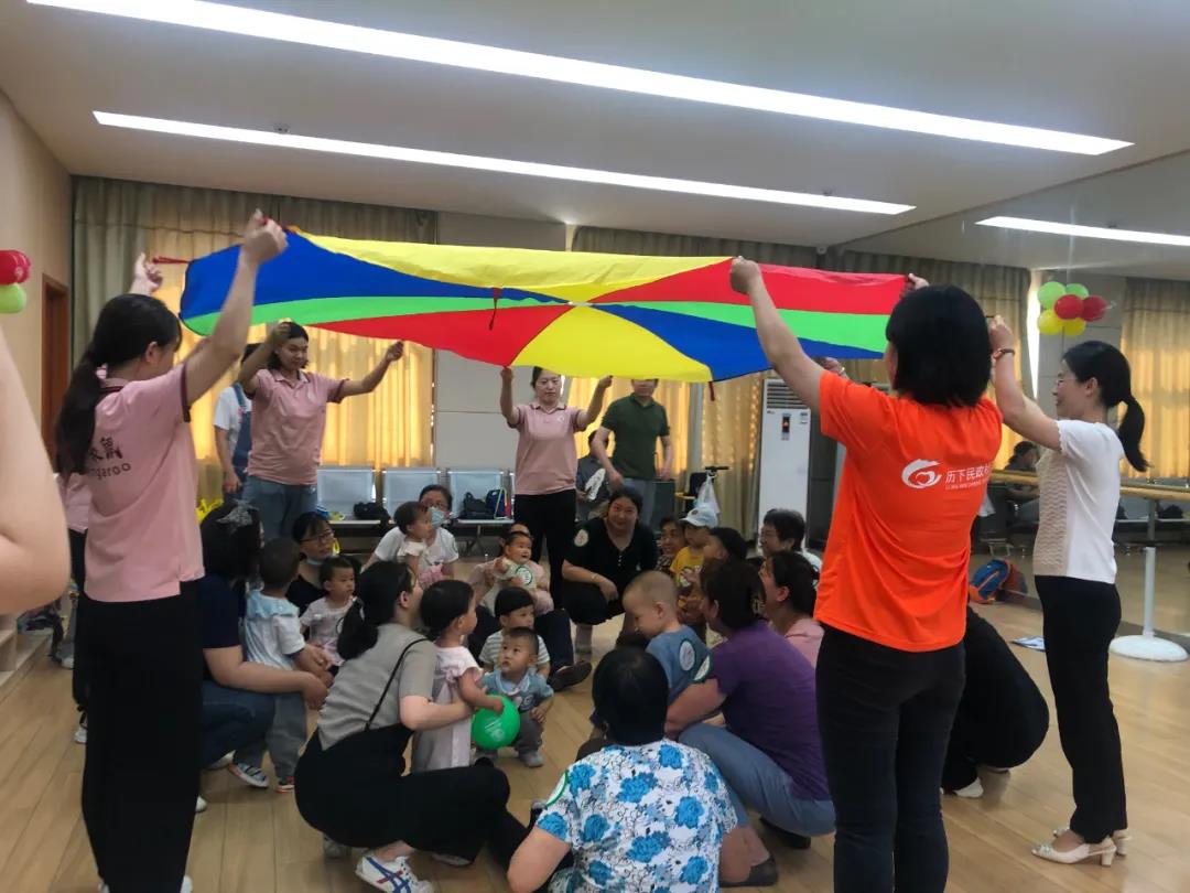 活动过程中,通过“小鲨鱼”游戏,小朋友们跟着音乐的节奏舞动双手,进入游戏情境中。在“小青蛙跳荷叶”的环节里,小朋友们和爸爸妈妈一起蹦蹦跳跳。在“七彩伞”游戏中,随着七彩伞的上下飘动,小朋友们和爸爸妈妈感受世界的多彩。